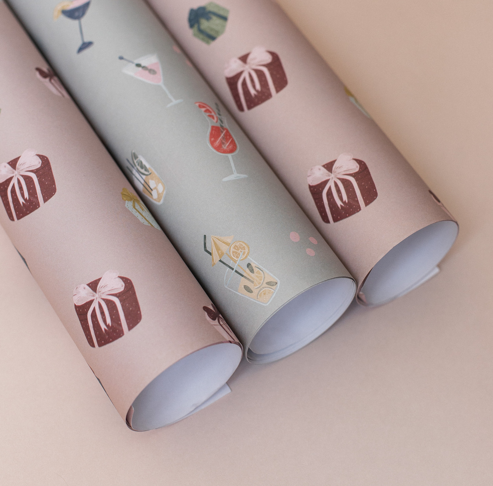 Коллекция подарочной упаковочной бумаги Celebration от алматинского бренда Happy Place состоит из двух дизайнов: иллюстрации с подарочными коробочками и иллюстрации с разными бокалами.